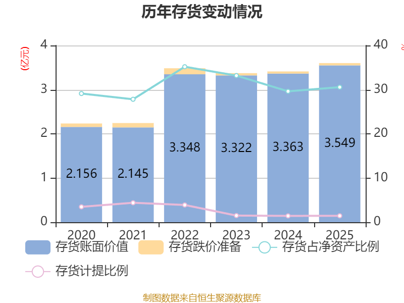 从存货变动来看,截至2025年末,公司存货账面价值为3.55亿元,占净资产的30.56%,较上年末增加1861.18万元。其中,存货跌价准备为520.69万元,计提比例为1.45%。