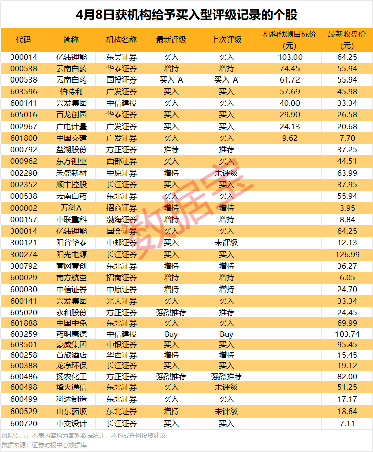 今日获机构买入型评级个股中,共有8条评级记录中对相关个股给出了预测目标价。以公布的预测目标价与最新收盘价进行对比显示,共有7股上涨空间超10%,亿纬锂能上涨空间最高,4月8日东吴证券预计公司目标价为103元,上涨空间达60.31%;上涨空间较高的个股还有云南白药、伯特利等,上涨空间分别为33.09%、25.47%。