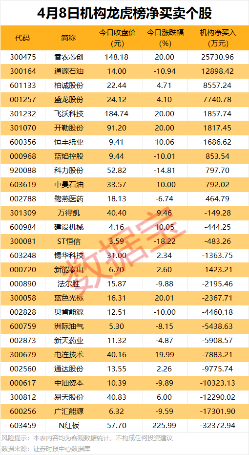 机构净卖出个股中,N红板遭机构净卖出3.24亿元,居首;紧随其后的是广汇能源、易天股份、中油资本,机构净卖出金额均超1亿元。