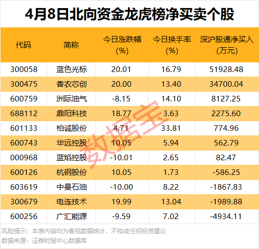 今日龙虎榜现身个股中,7股获北向资金净买入。净买入居首的是蓝色光标,金额为5.19亿元;香农芯创紧随其后,净买入金额3.47亿元。