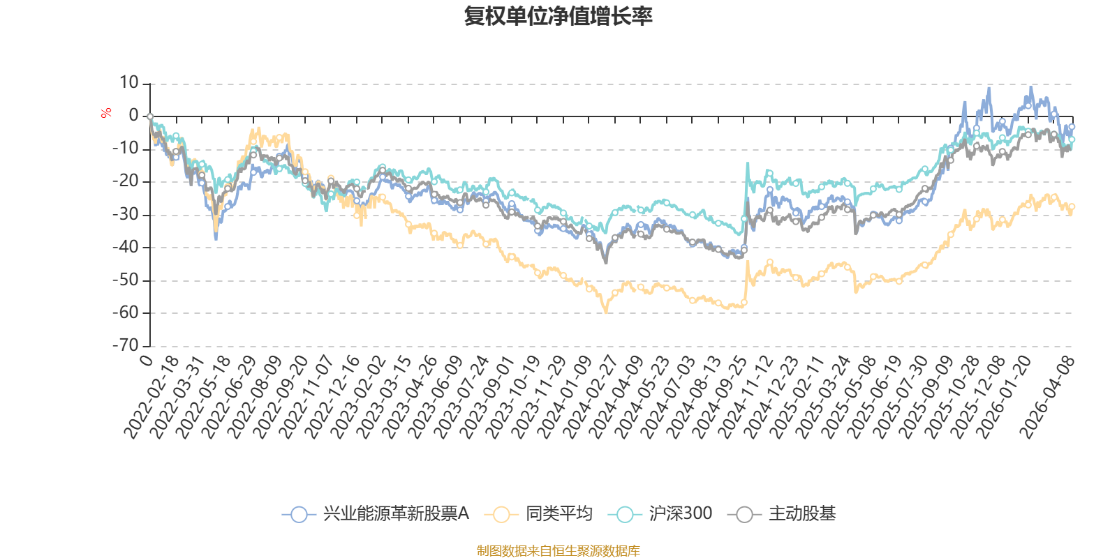 截至4月8日,兴业能源革新股票A近三个月复权单位净值增长率为-4.91%,位于同类可比基金32/39;近半年复权单位净值增长率为-6.14%,位于同类可比基金31/39;近一年复权单位净值增长率为50.48%,位于同类可比基金22/39;近三年复权单位净值增长率为25.15%,位于同类可比基金9/33。