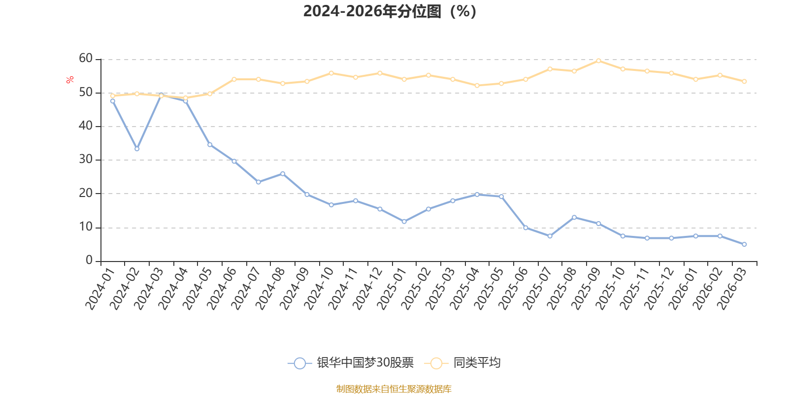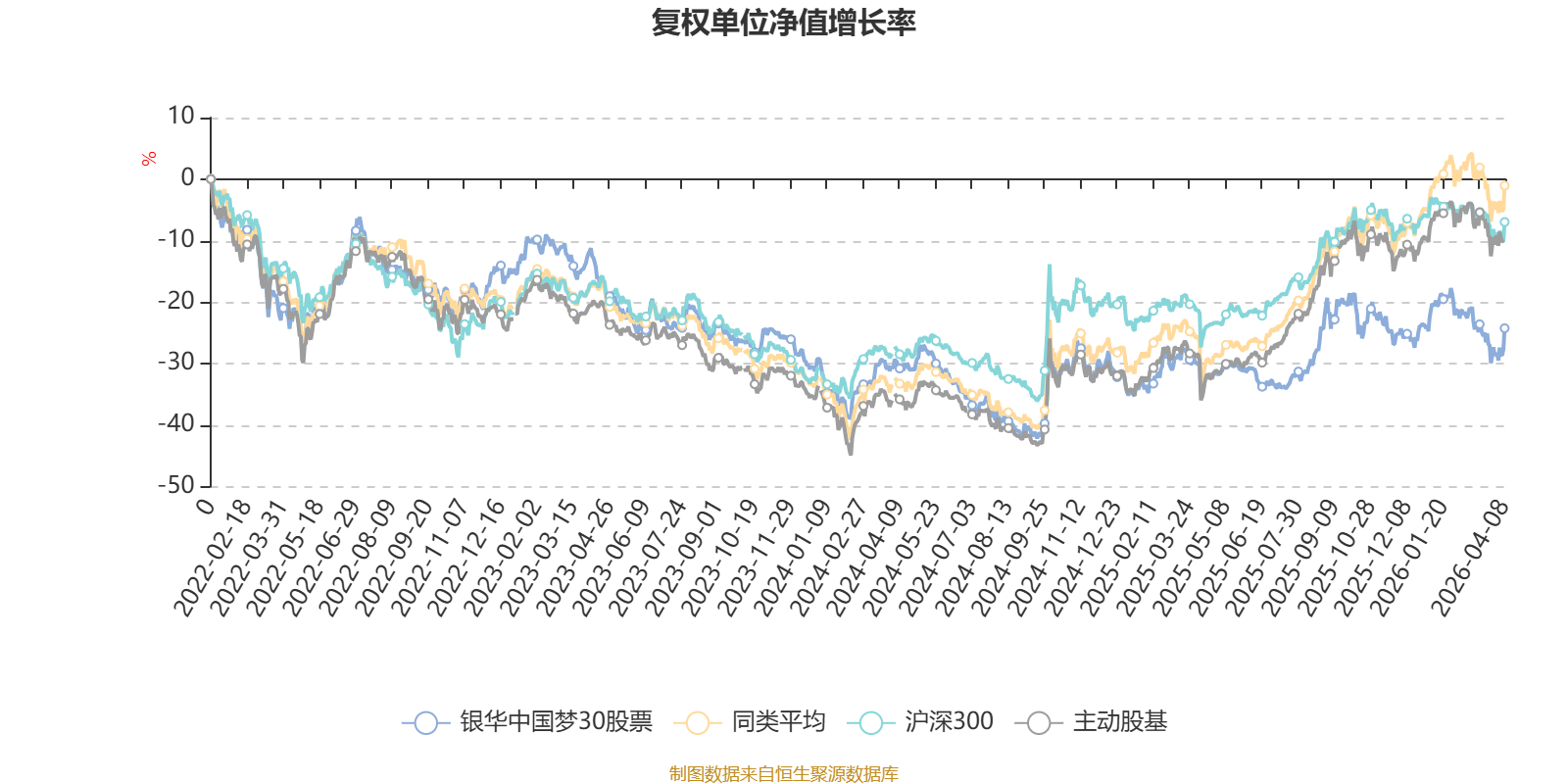 截至4月8日,银华中国梦30股票近三个月复权单位净值增长率为-4.67%,位于同类可比基金131/167;近半年复权单位净值增长率为-6.72%,位于同类可比基金141/167;近一年复权单位净值增长率为15.76%,位于同类可比基金149/165;近三年复权单位净值增长率为-13.15%,位于同类可比基金145/157。