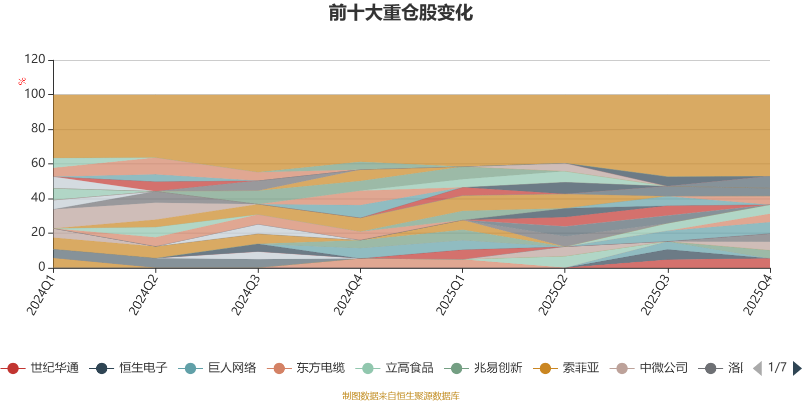 该基金持股集中度较高。截至2025年末,基金十大重仓股分别是中际旭创、宁德时代、世纪华通、工业富联、盐津铺子、中微公司、寒武纪、洛阳钼业、兆易创新、新易盛。