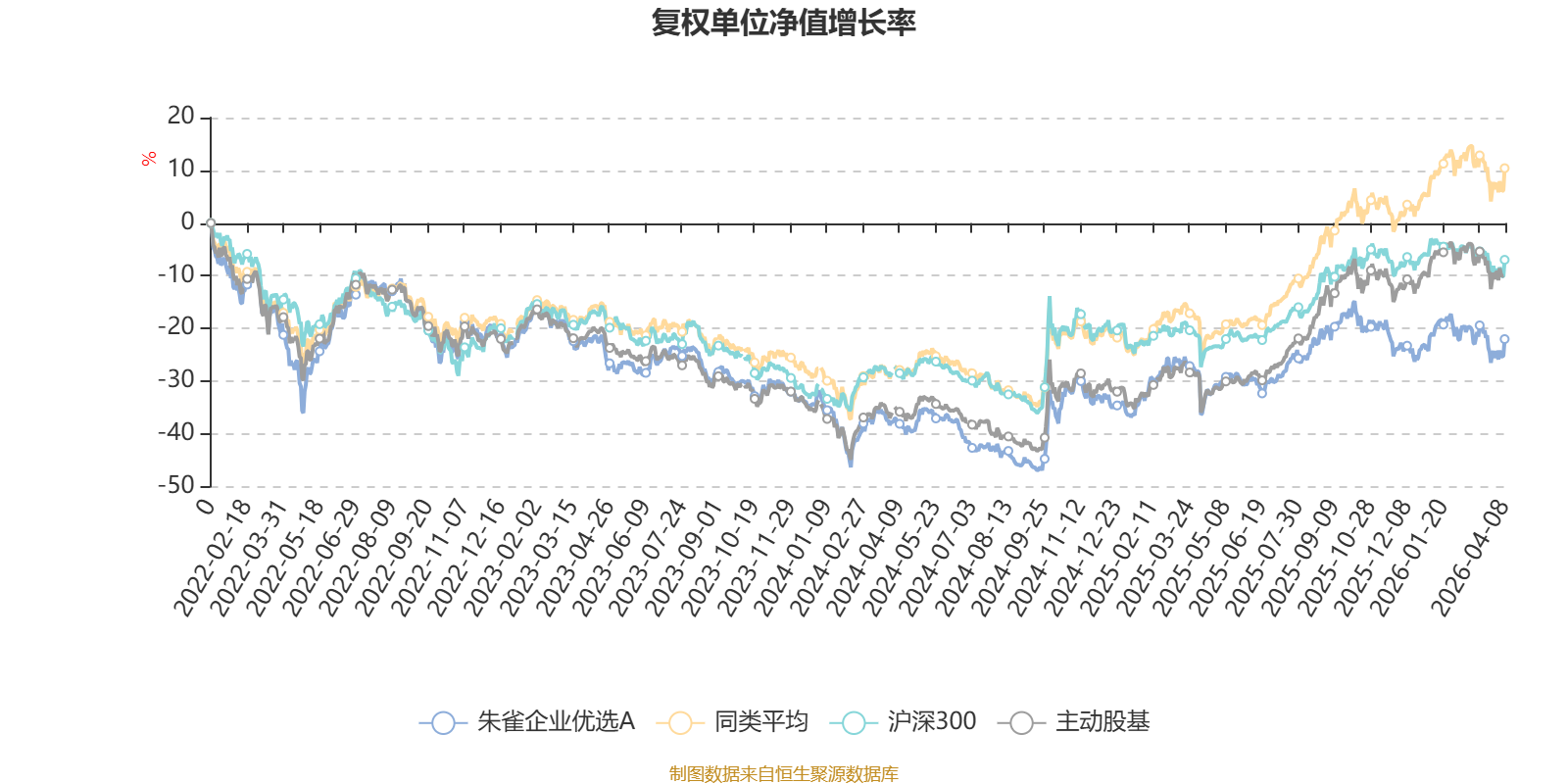 截至4月8日,朱雀企业优选A近三个月复权单位净值增长率为-0.72%,位于同类可比基金35/58;近半年复权单位净值增长率为-8.10%,位于同类可比基金53/58;近一年复权单位净值增长率为22.07%,位于同类可比基金46/57;近三年复权单位净值增长率为-0.42%,位于同类可比基金52/57。