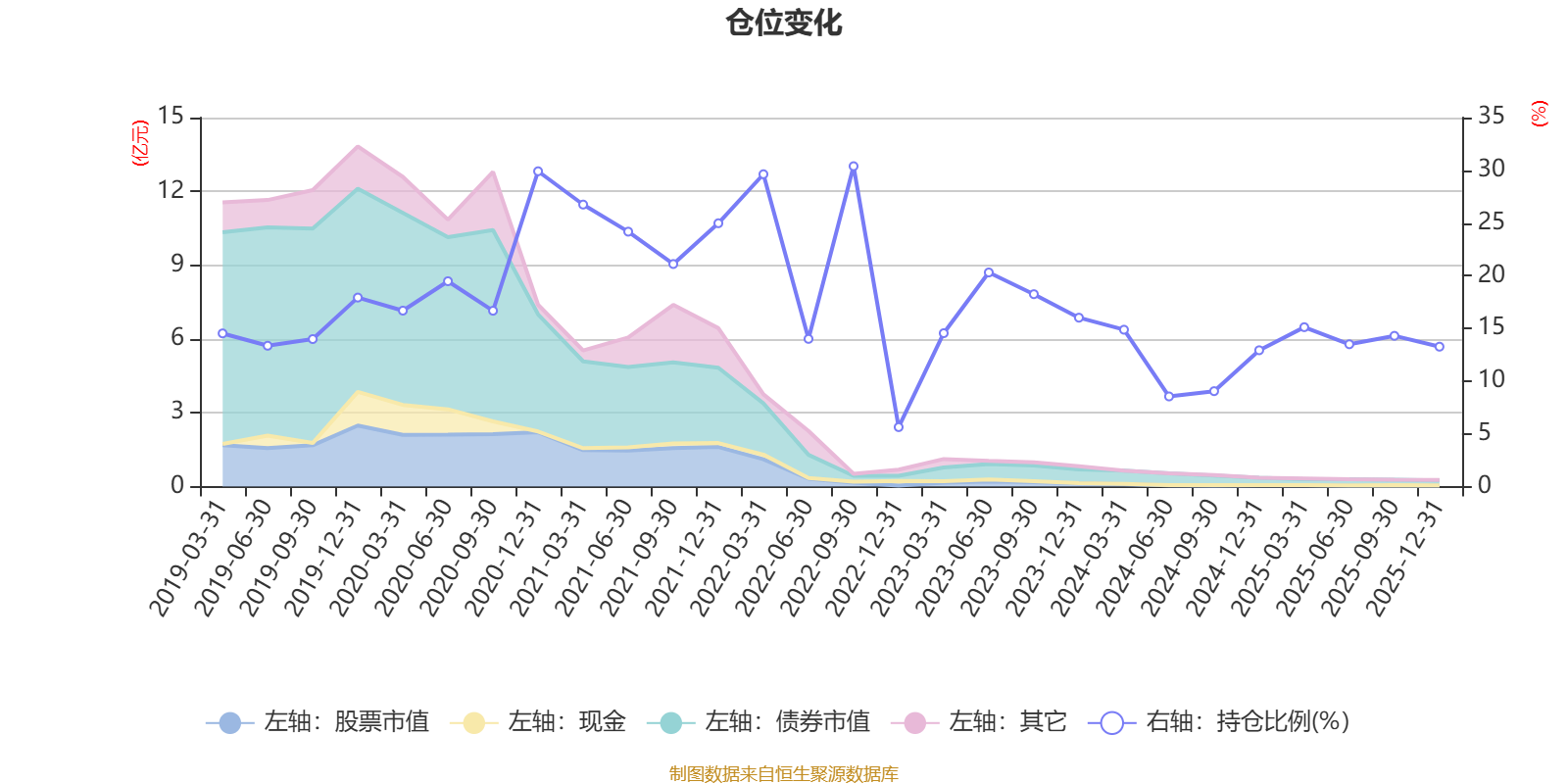 据定期报告数据统计,近三年平均股票仓位为14.23%,同类平均为72.57%。2022年三季度末基金达到30.39%的最高仓位,2022年末最低,为5.64%。