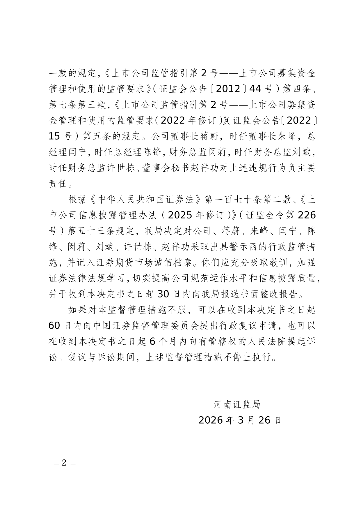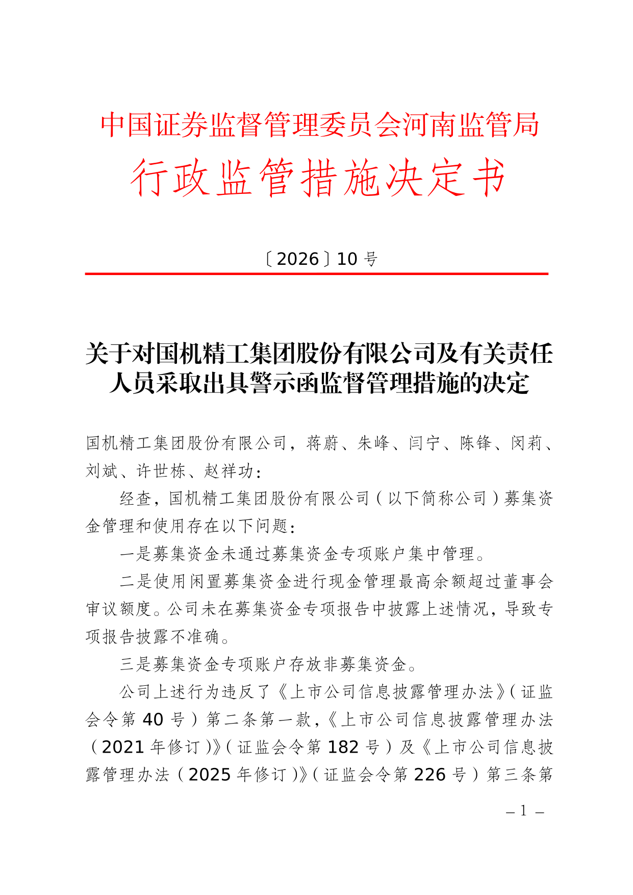 对此,河南证监局决定对国机精工集团股份有限公司、蒋蔚、朱峰、闫宁、陈锋、闵莉、刘斌、许世栋、赵祥功采取出具警示函的行政监管措施,并记入证券期货市场诚信档案。