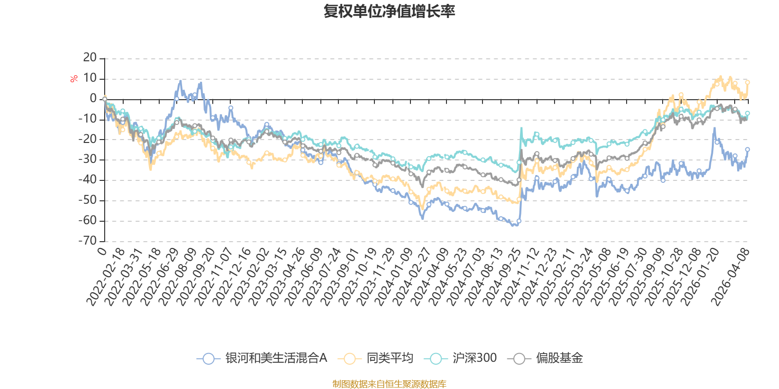 截至4月8日,银河和美生活混合A近三个月复权单位净值增长率为2.53%,位于同类可比基金107/229;近半年复权单位净值增长率为11.30%,位于同类可比基金75/229;近一年复权单位净值增长率为44.85%,位于同类可比基金170/229;近三年复权单位净值增长率为-3.71%,位于同类可比基金161/171。