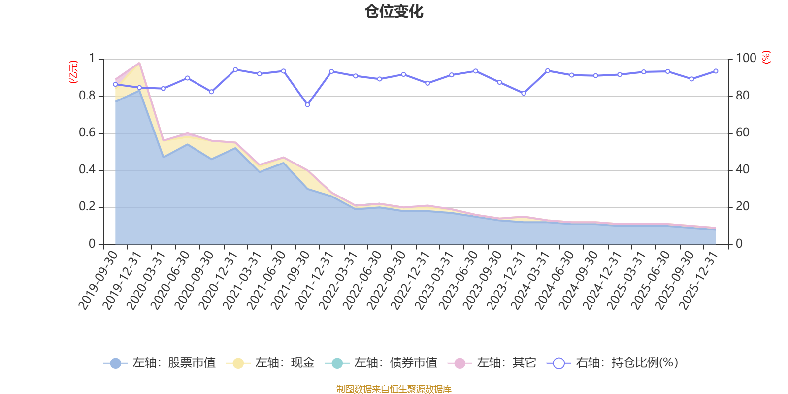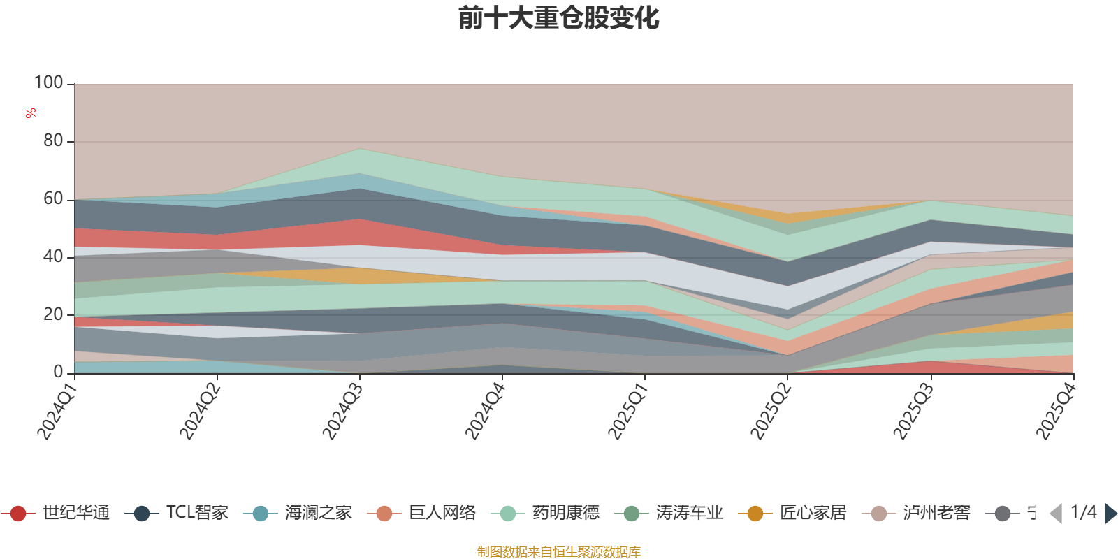 该基金持股集中度较高。截至2025年末,基金十大重仓股分别是宁德时代、招商银行、巨人网络、匠心家居、涛涛车业、贵州茅台、新澳股份、药明康德、若羽臣、小商品城。