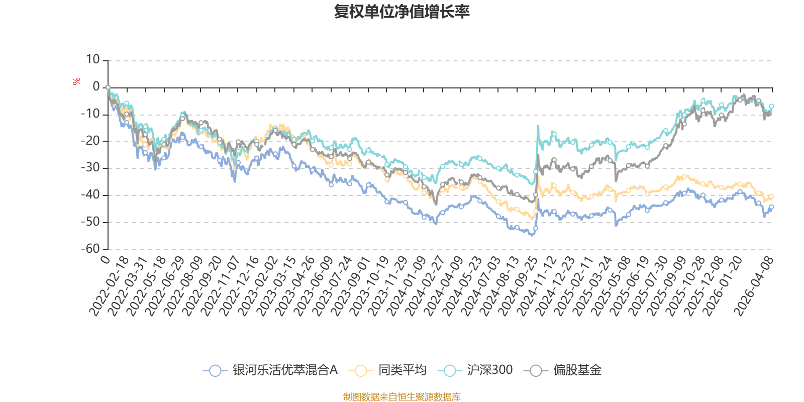 截至4月8日,银河乐活优萃混合A近三个月复权单位净值增长率为-7.05%,位于同类可比基金51/85;近半年复权单位净值增长率为-9.47%,位于同类可比基金33/85;近一年复权单位净值增长率为13.68%,位于同类可比基金12/85;近三年复权单位净值增长率为-22.85%,位于同类可比基金38/76。