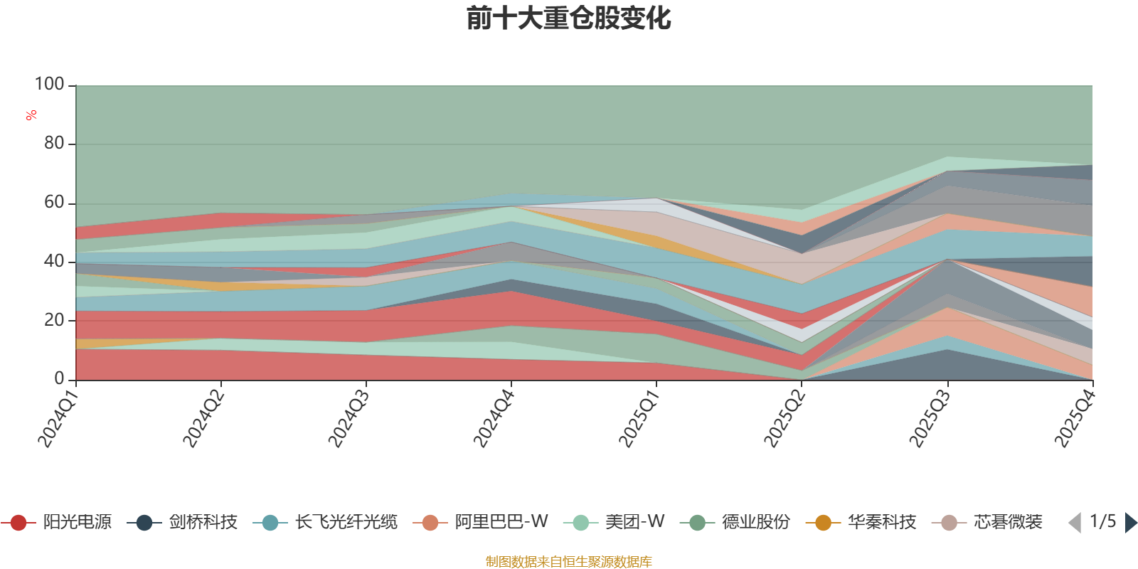 该基金持股集中度较高。截至2025年末,基金十大重仓股分别是中际旭创、新易盛、工业富联、生益科技、腾讯控股、源杰科技、芯碁微装、胜宏科技、阿里巴巴-W、中钨高新。