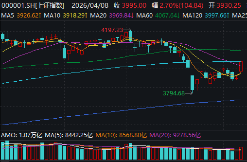 上证指数4月8日高开后一路走高,不仅轻松突破3936点强压力位,同时还顺利站上了行情短期分水岭的20日均线,最终在全日最高点收盘,距离4000点整数关口仅一步之遥。