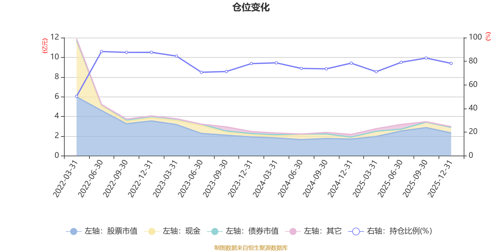 据定期报告数据统计,近三年平均股票仓位为76.69%,同类平均为72.57%。2022年上半年末基金达到88.28%的最高仓位,2022年一季度末最低,为50.27%。