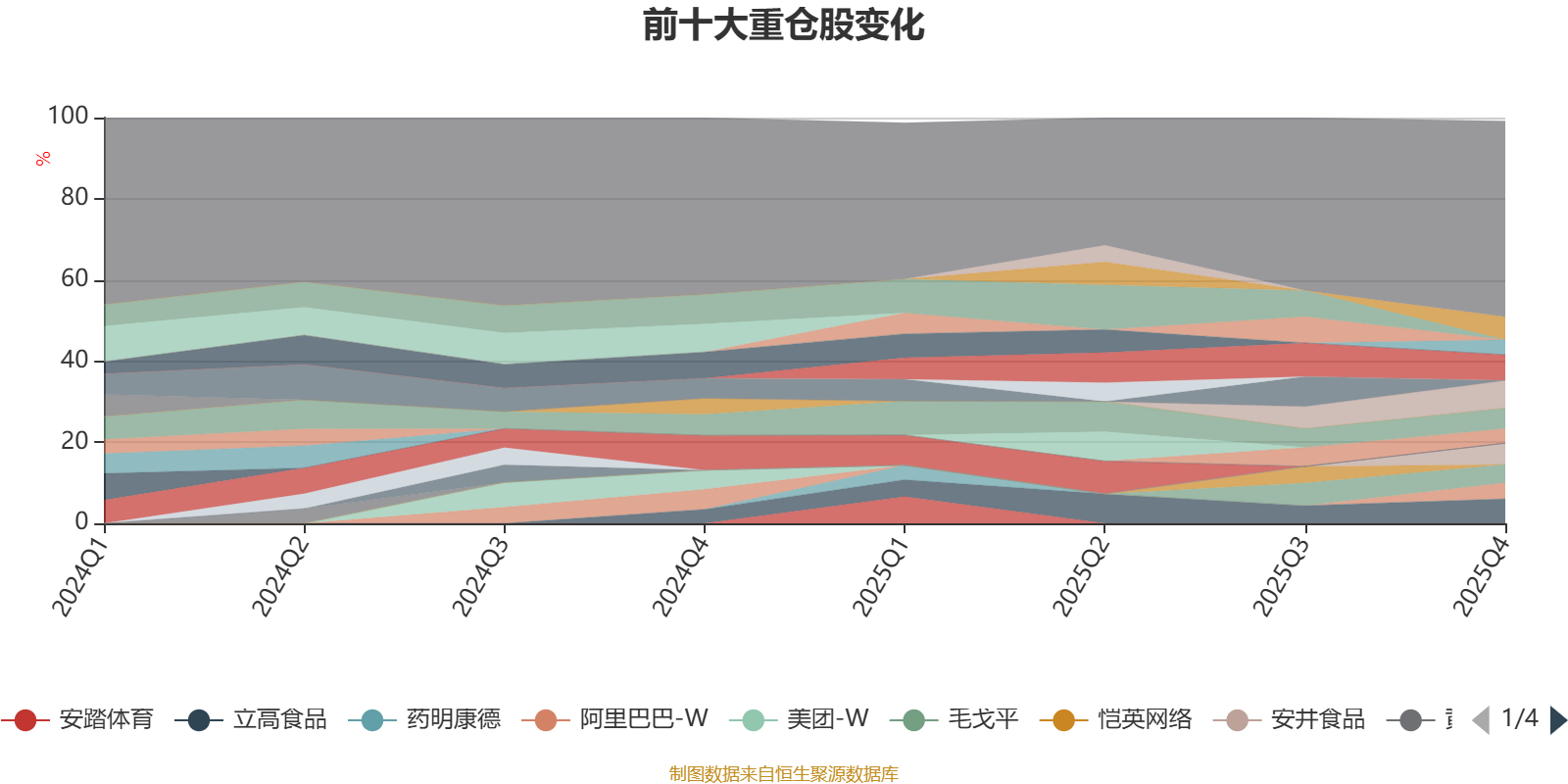 该基金持股集中度较高。截至2025年末,基金十大重仓股分别是华夏航空、腾讯控股、立高食品、燕京啤酒、安井食品、东鹏饮料、毛戈平、阿里巴巴-W、古茗、海大集团。