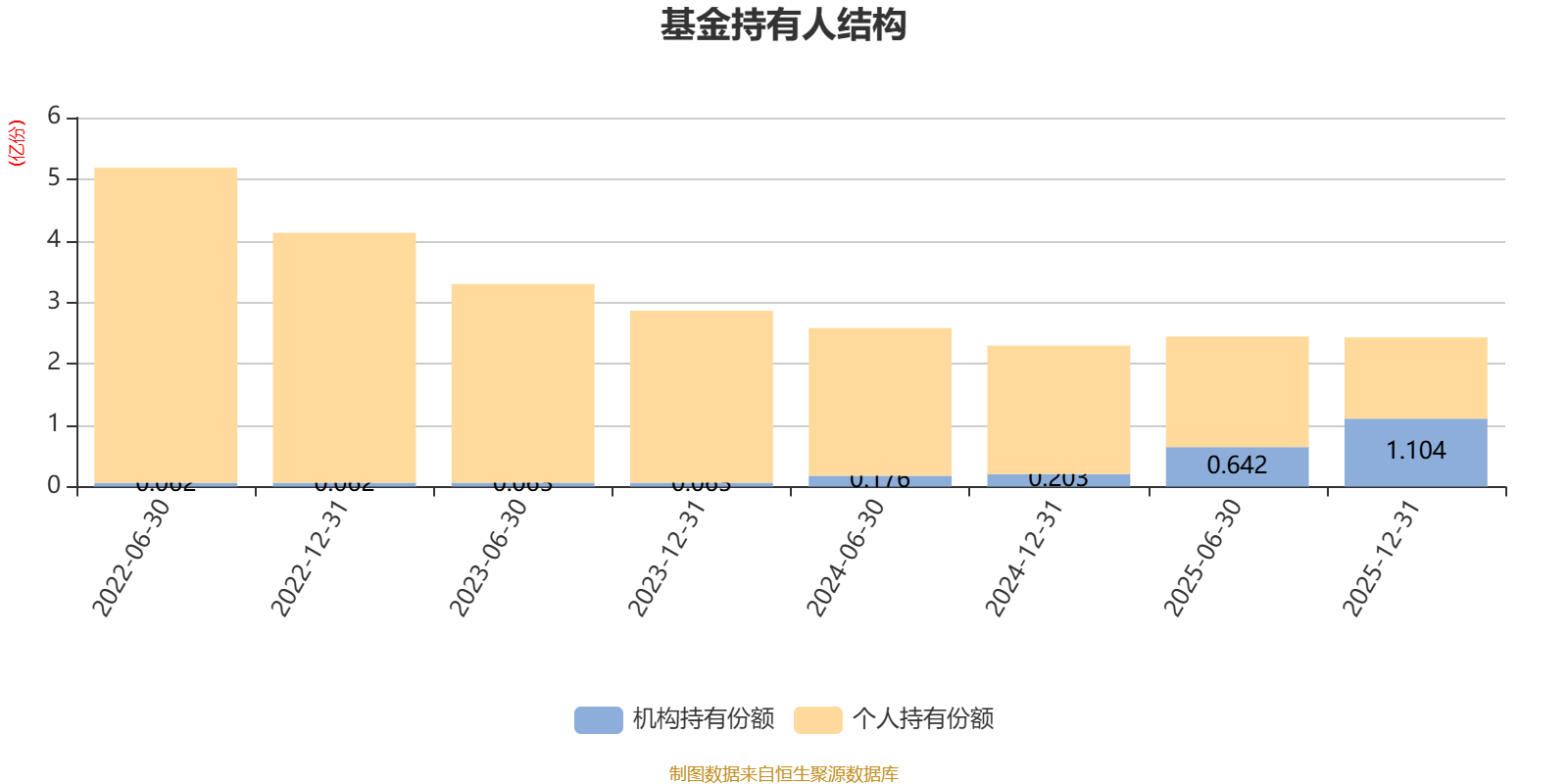 截至2025年12月31日,基金持有人共计2942户,合计持有2.43亿份。其中管理人员工持有70.4万份,占比0.29%,机构持有份额占比45.48%,个人投资者占比54.52%。