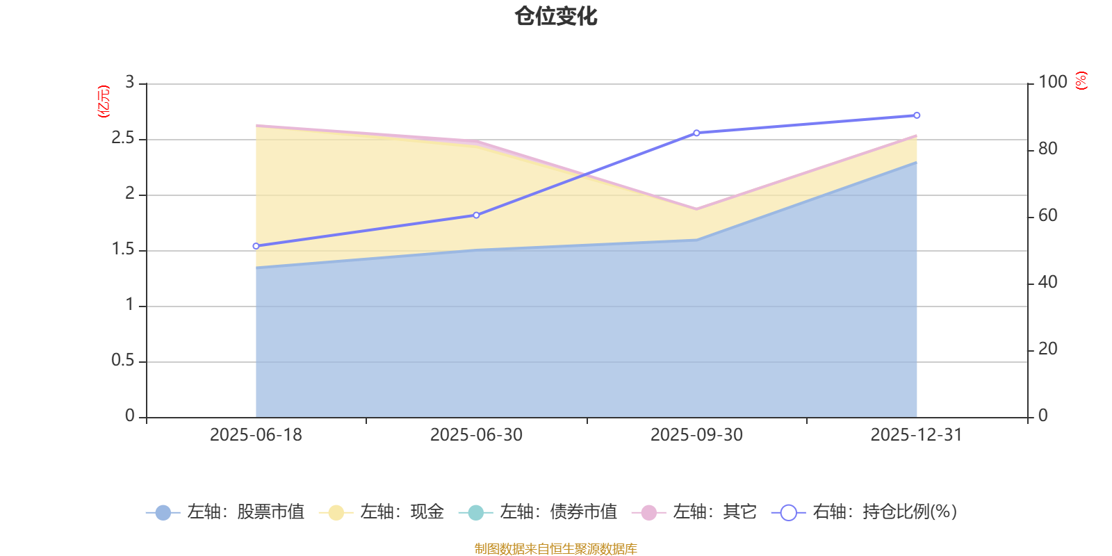 据定期报告数据统计,成立以来平均股票仓位为71.83%,同类平均为85.83%。2025年末基金达到90.44%的最高仓位,2025年上半年末最低,为51.24%。