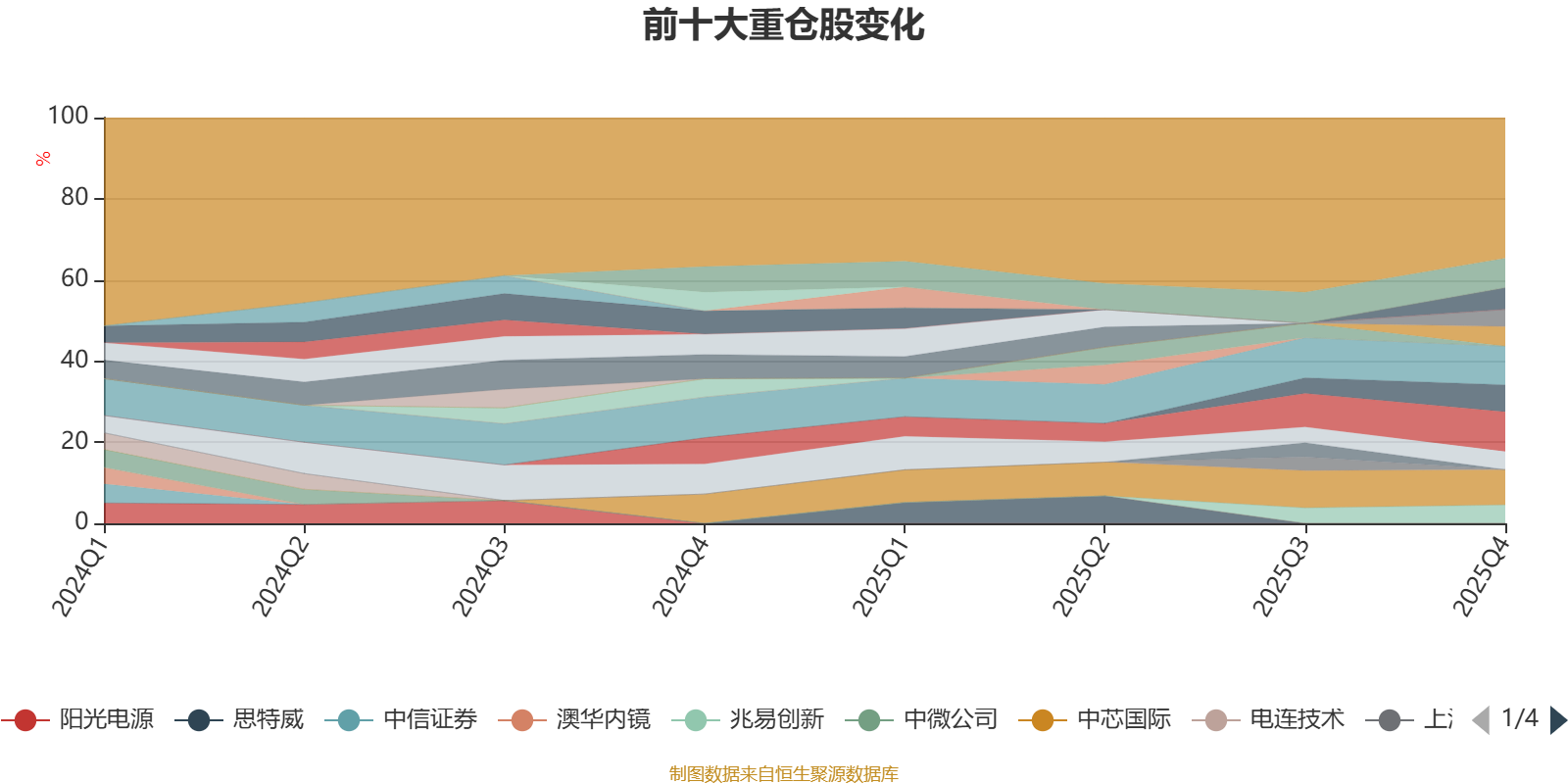 截至2025年末,基金十大重仓股分别是寒武纪、宁德时代、中芯国际、海光信息、源杰科技、北方华创、江淮汽车、兆易创新、德业股份、联影医疗。