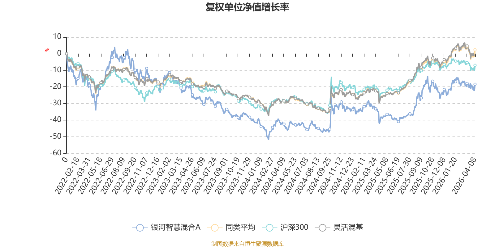 截至4月8日,银河智慧混合A近三个月复权单位净值增长率为-1.64%,位于同类可比基金843/1287;近半年复权单位净值增长率为-4.20%,位于同类可比基金1054/1286;近一年复权单位净值增长率为41.08%,位于同类可比基金511/1286;近三年复权单位净值增长率为1.63%,位于同类可比基金943/1286。