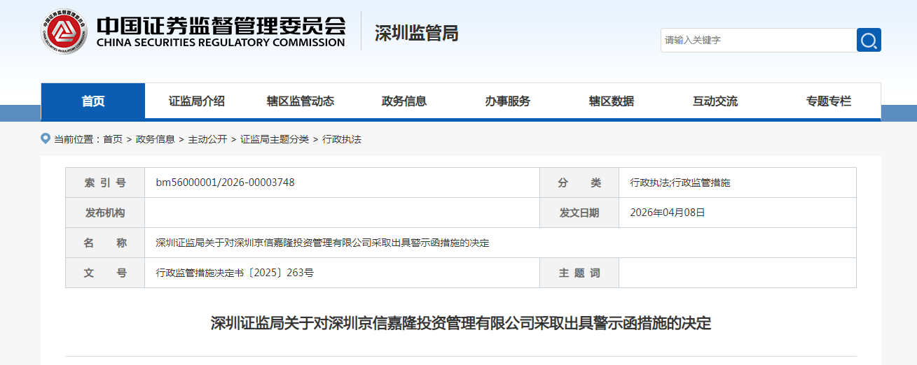 根据深圳证监局4月8日公告,深圳京信嘉隆投资管理有限公司(简称“京信嘉隆资管”)因多项违规收警示函。