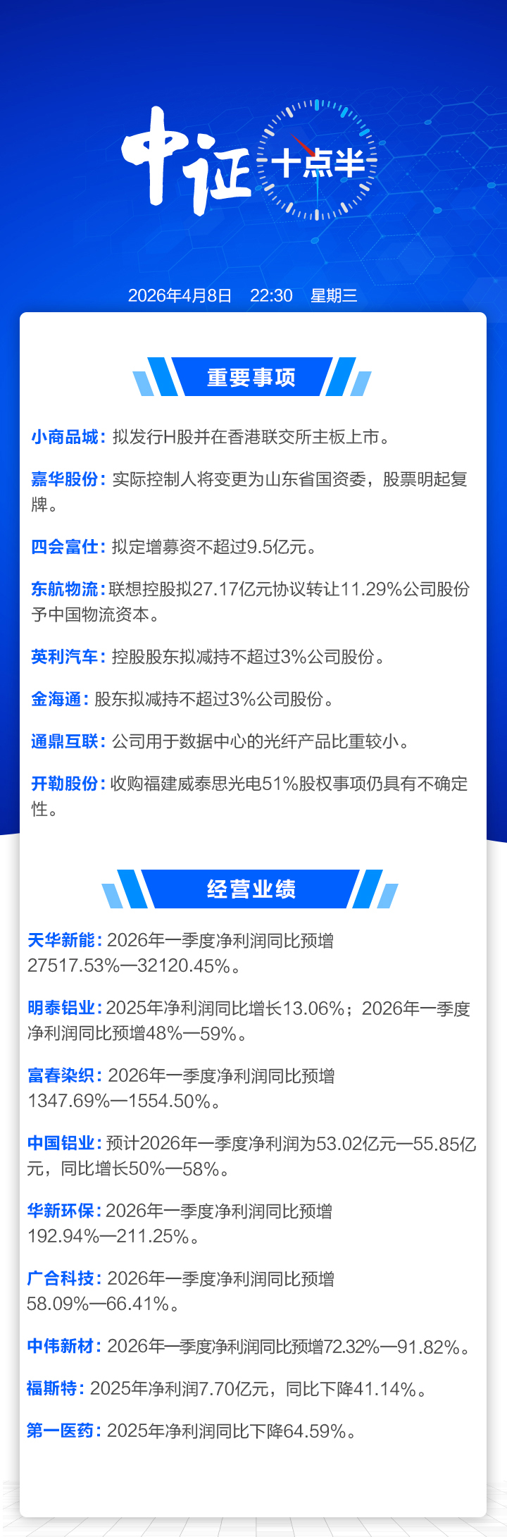 【中证十点半】天华新能一季度净利润预增超270倍;嘉华股份明日复牌;小商品城拟赴港上市