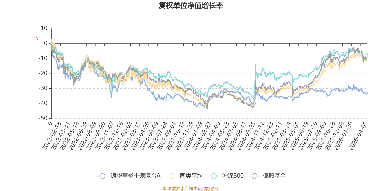 截至4月8日,银华富裕主题混合A近三个月复权单位净值增长率为-5.38%,位于同类可比基金19/20;近半年复权单位净值增长率为1.67%,位于同类可比基金9/20;近一年复权单位净值增长率为6.55%,位于同类可比基金18/20;近三年复权单位净值增长率为-11.15%,位于同类可比基金19/19。