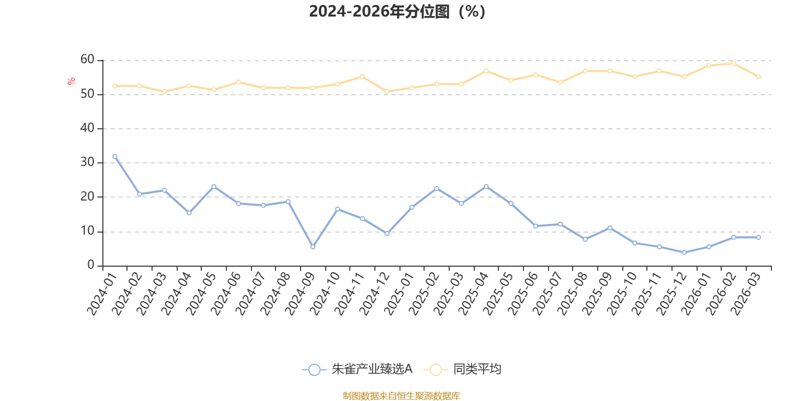 通过所选区间该基金净值增长率分位图,可以观察该基金与同类基金业绩比较情况。图为坐标原点到区间内某时点的净值增长率在同类基金中的分位数。