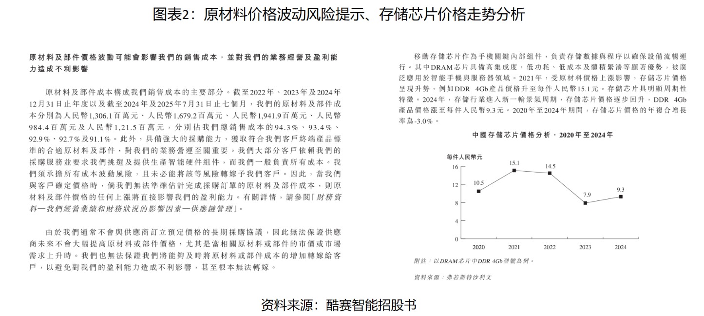 酷赛智能向时代商业研究院表示,招股书的“风险因素” 章节已全面、如实披露了公司经营过程中面临的各类重大风险,包括但不限于原材料价格波动风险、供应链风险、市场竞争风险等。相关披露符合港交所关于 “披露所有重大及具体风险” 的监管要求。存储芯片价格受全球产业链供需影响处于动态变化中,后续公司将持续关注市场走势,并严格按照香港上市监管要求,及时、完整地更新相关风险披露内容。