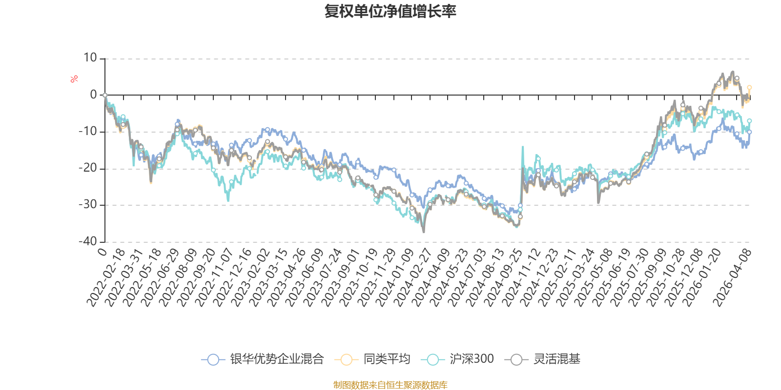 截至4月8日,银华优势企业混合近三个月复权单位净值增长率为0.06%,位于同类可比基金664/1287;近半年复权单位净值增长率为0.59%,位于同类可比基金819/1286;近一年复权单位净值增长率为20.17%,位于同类可比基金889/1286;近三年复权单位净值增长率为1.17%,位于同类可比基金953/1286。