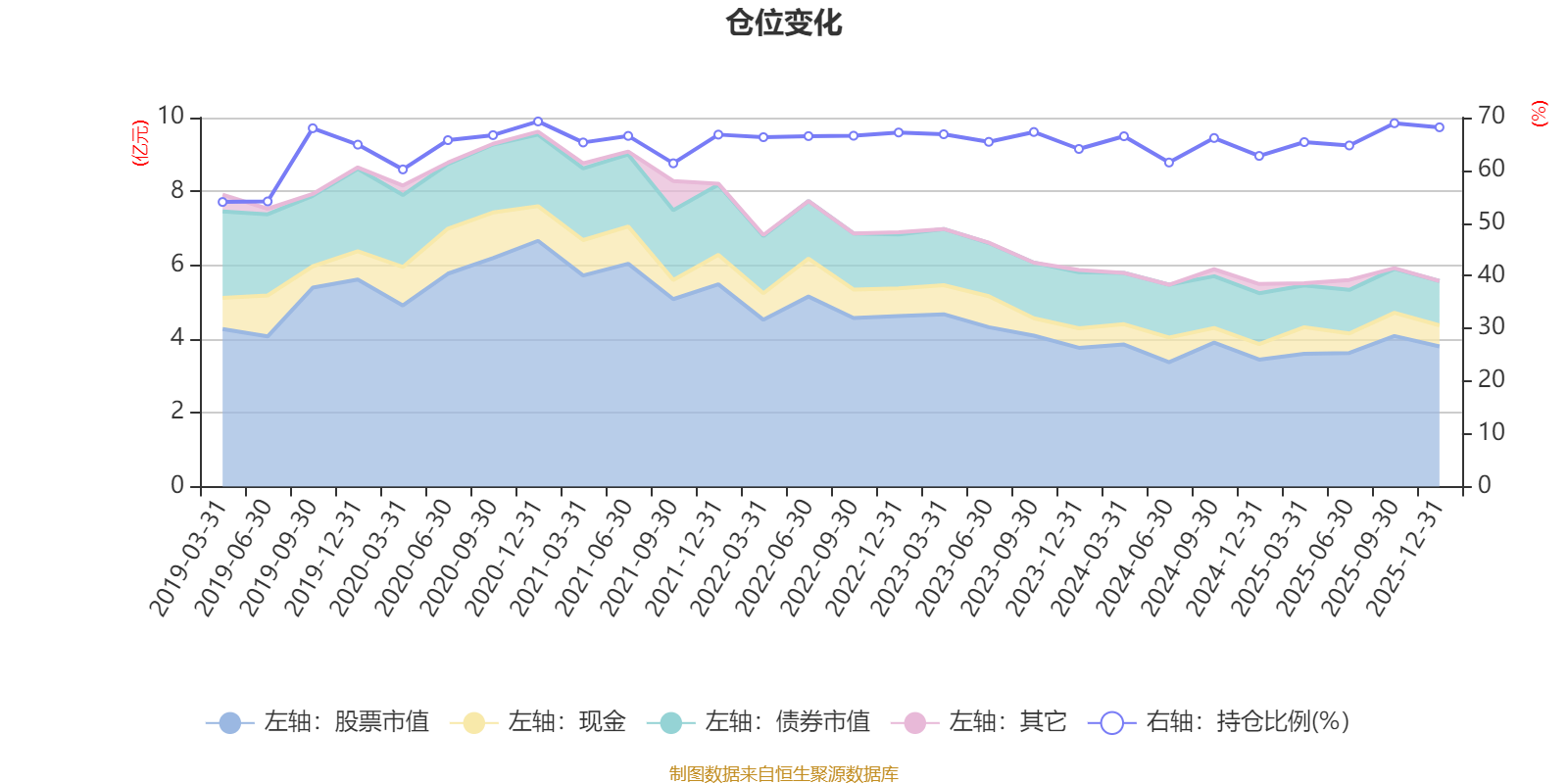据定期报告数据统计,近三年平均股票仓位为65.63%,同类平均为72.57%。2020年末基金达到69.27%的最高仓位,2019年一季度末最低,为53.99%。