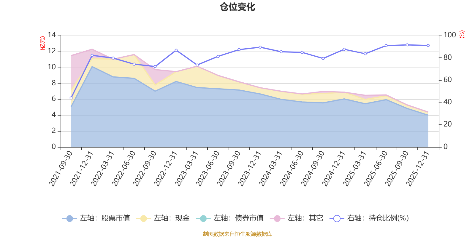 据定期报告数据统计,近三年平均股票仓位为85.57%,同类平均为86.12%。2025年三季度末基金达到91.62%的最高仓位,2021年三季度末最低,为44.05%。