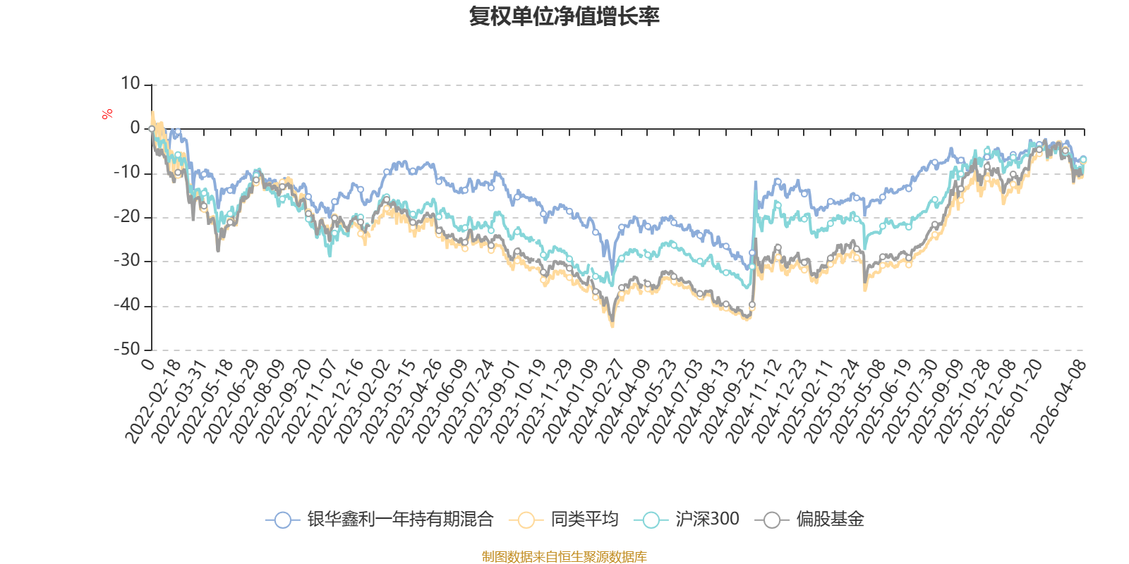 截至4月8日,银华鑫利一年持有期混合近三个月复权单位净值增长率为-3.04%,位于同类可比基金196/265;近半年复权单位净值增长率为2.46%,位于同类可比基金118/265;近一年复权单位净值增长率为13.73%,位于同类可比基金245/265;近三年复权单位净值增长率为0.78%,位于同类可比基金204/261。
