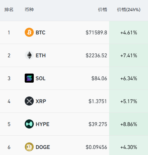 加密货币主要币种涨幅扩大,比特币涨超4%报71589美元/枚,以太坊涨超7%,SOL涨超6%,XRP涨超5%。过去24小时,全市场超11万人被爆仓。