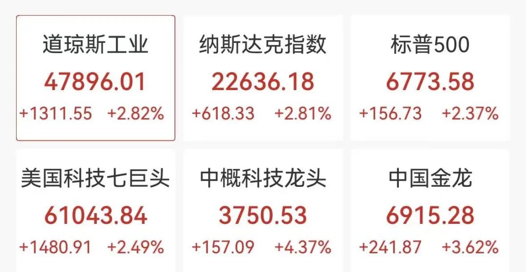 4月8日,美股三大指数大幅高开,截至发稿,道指涨2.82%,纳指涨2.81%,标普500指数涨2.37%。