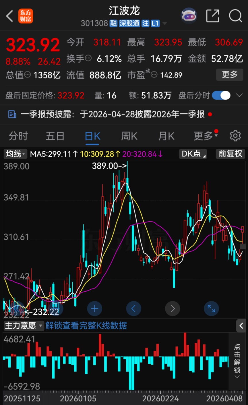 截至4月8日收盘,江波龙股价报323.92元/股,涨幅达8.88%,总市值为1358亿元。