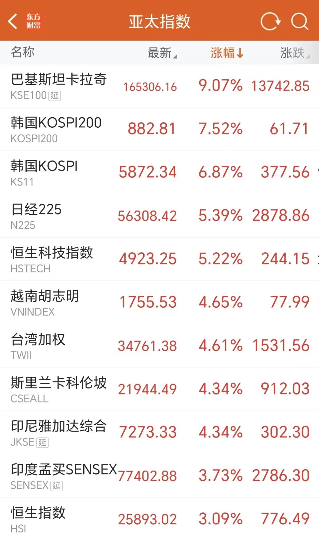 其他亚洲指数方面,巴基斯坦卡拉奇指数涨超9%,日经225指数、恒生科技指数大涨超5%,恒生指数涨超3%。