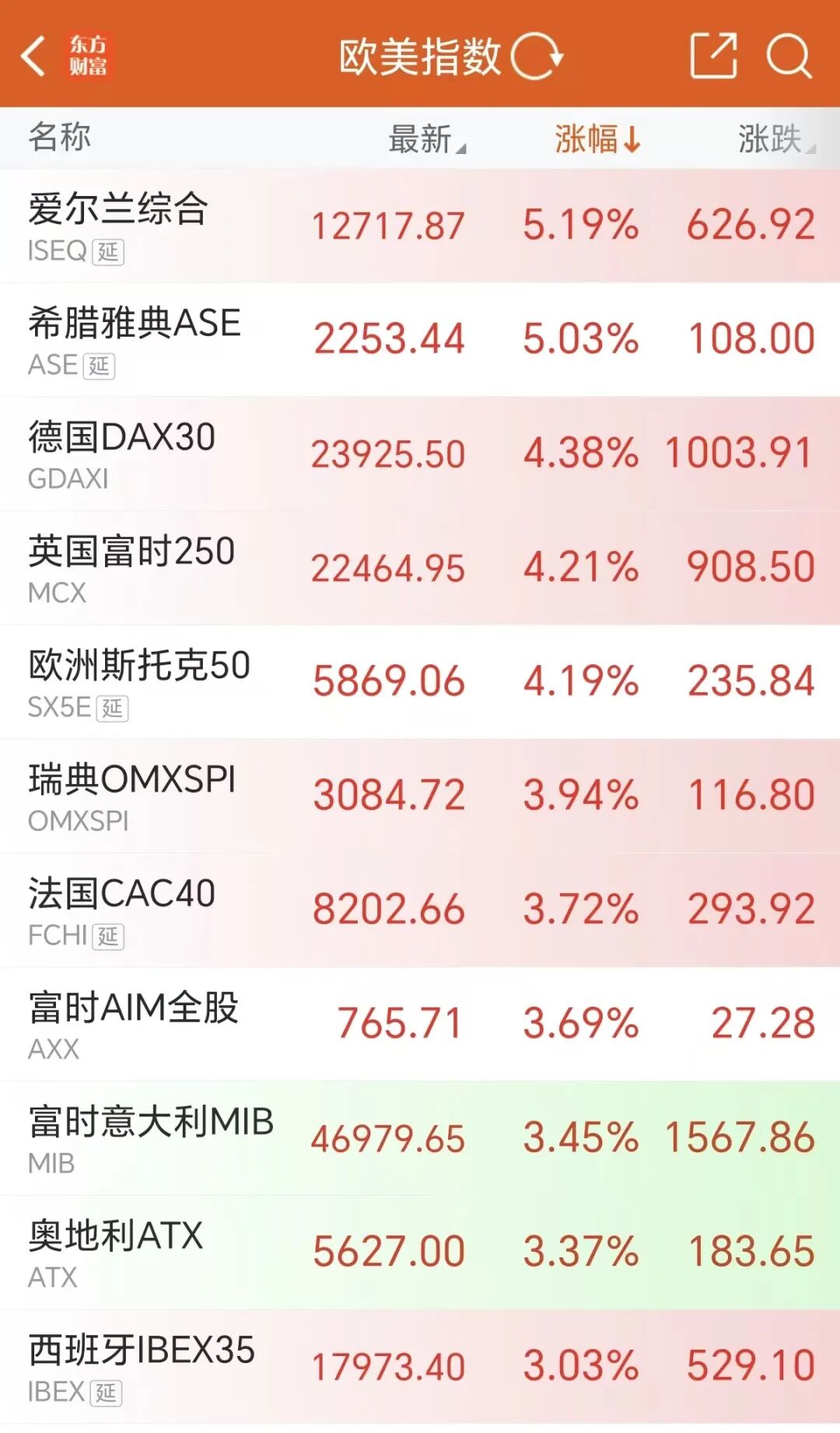 欧洲市场方面,截至发稿,欧洲斯托克50指数涨超4%,德国DAX、法国CAC40、英国富时100指数涨幅均超2%。