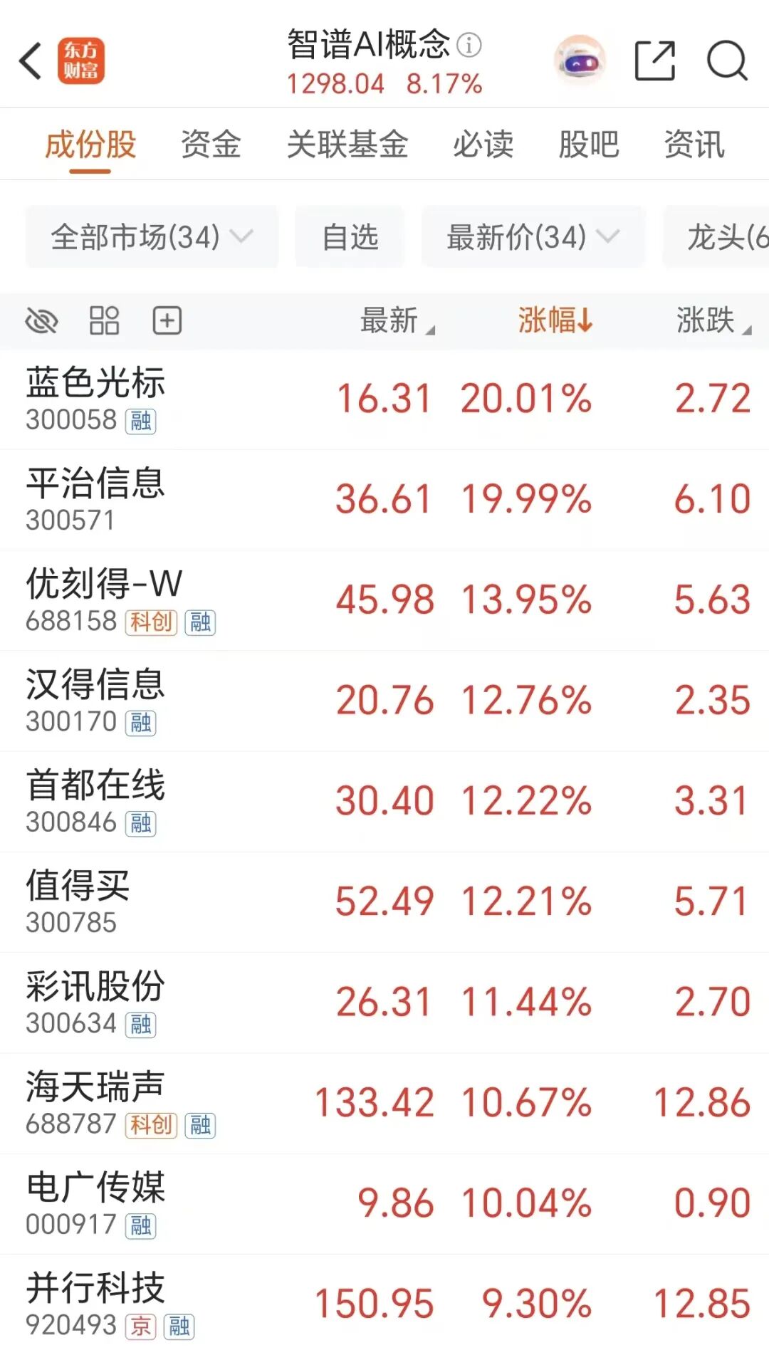 周三带领市场大反攻的无疑是AI为代表的科技股。智谱AI概念大涨超8%,蓝色光标、平冶信息20CM涨停,优刻得、汉得信息、首都在线等涨超10%。