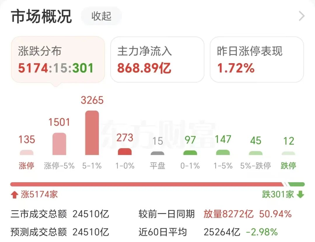 受隔夜美伊局势缓和影响,周三(4月8日)市场迎来大奇迹日,沪指百点长阳,创业板指涨近6%、科创50指数涨超6%。三市成交额2.45万亿,较上一个交易日放量8272亿。截至收盘,沪指涨2.7%,深成指涨4.79%,创业板指涨5.91%。