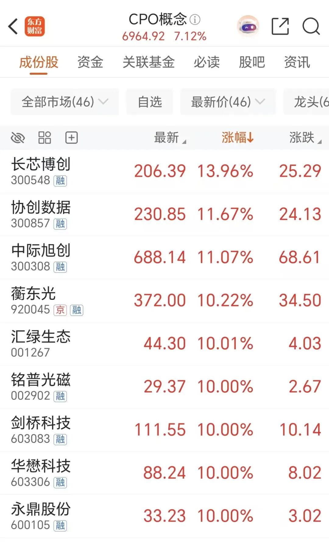 AI软件股在智谱概念带领下大涨,AI硬件股则在CPO概念带领下表现强势,个股方面,长芯博创涨近14%,龙头股中际旭创涨超11%,且股价再创历史新高,铭普光磁、剑桥科技等多股涨停。