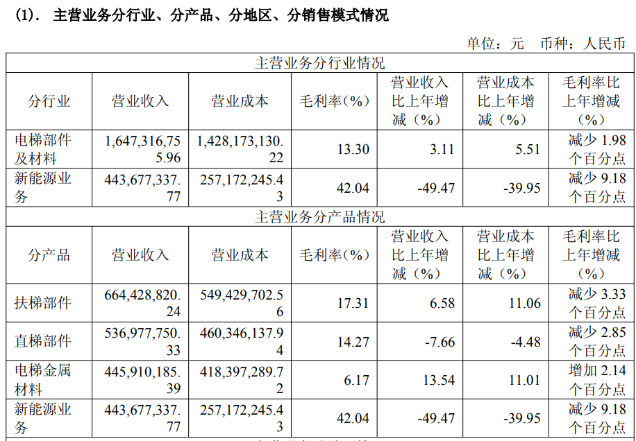 营收方面,分业务来看,电梯部件及材料业务实现营收16.47亿元,同比增长3.11%,增幅虽小,但仍构成营收的稳定支撑;而新能源业务营收仅为4.44亿元,同比大幅下降49.47%近乎腰斩,成为拉低公司营收的主要因素。