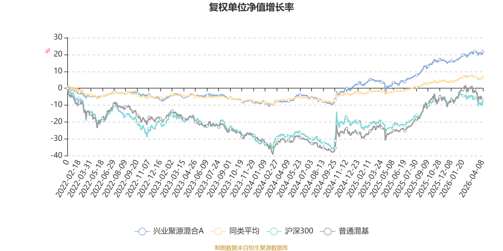 截至4月8日,兴业聚源混合A近三个月复权单位净值增长率为3.25%,位于同类可比基金35/629;近半年复权单位净值增长率为4.18%,位于同类可比基金71/629;近一年复权单位净值增长率为24.46%,位于同类可比基金29/629;近三年复权单位净值增长率为26.05%,位于同类可比基金33/581。