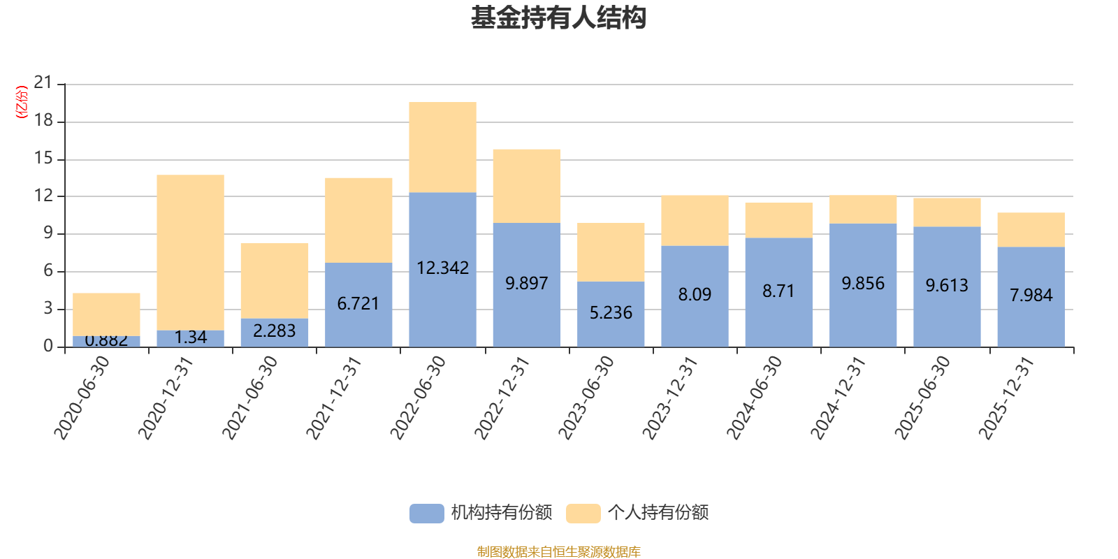截至2025年12月31日,基金持有人共计1.08万户,合计持有10.72亿份。其中管理人员工持有176.65万份,占比0.16%,机构持有份额占比74.48%,个人投资者占比25.52%。