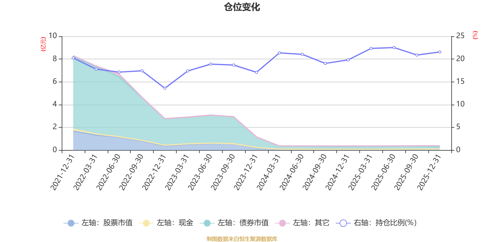 据定期报告数据统计,近三年平均股票仓位为20.06%,同类平均为19.2%。2025年上半年末基金达到22.53%的最高仓位,2022年末最低,为13.61%。