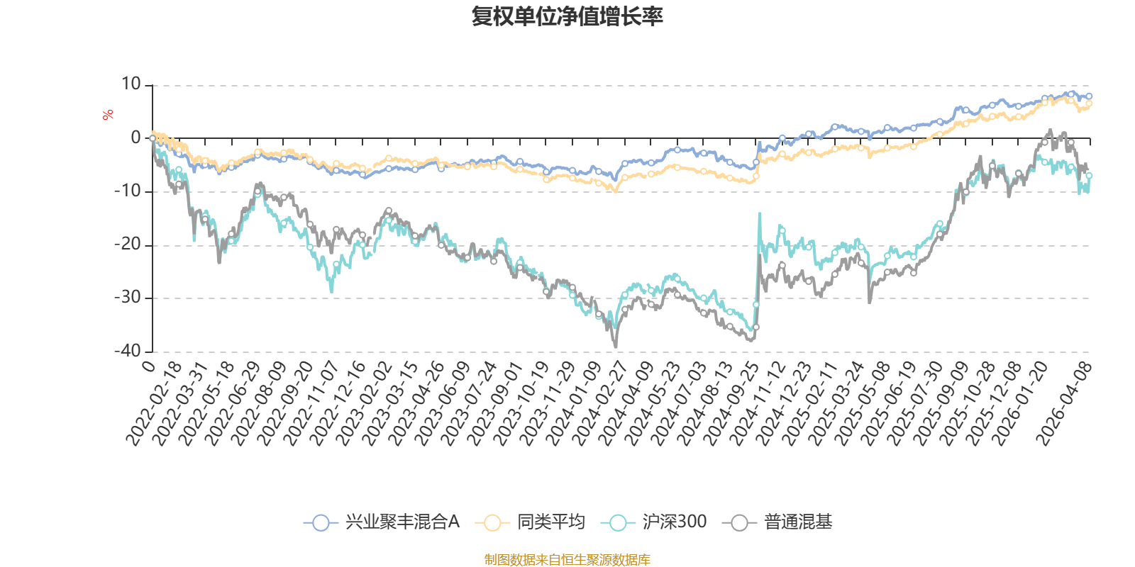 截至4月8日,兴业聚丰混合A近三个月复权单位净值增长率为0.99%,位于同类可比基金191/629;近半年复权单位净值增长率为2.68%,位于同类可比基金173/629;近一年复权单位净值增长率为8.05%,位于同类可比基金287/629;近三年复权单位净值增长率为13.18%,位于同类可比基金210/581。