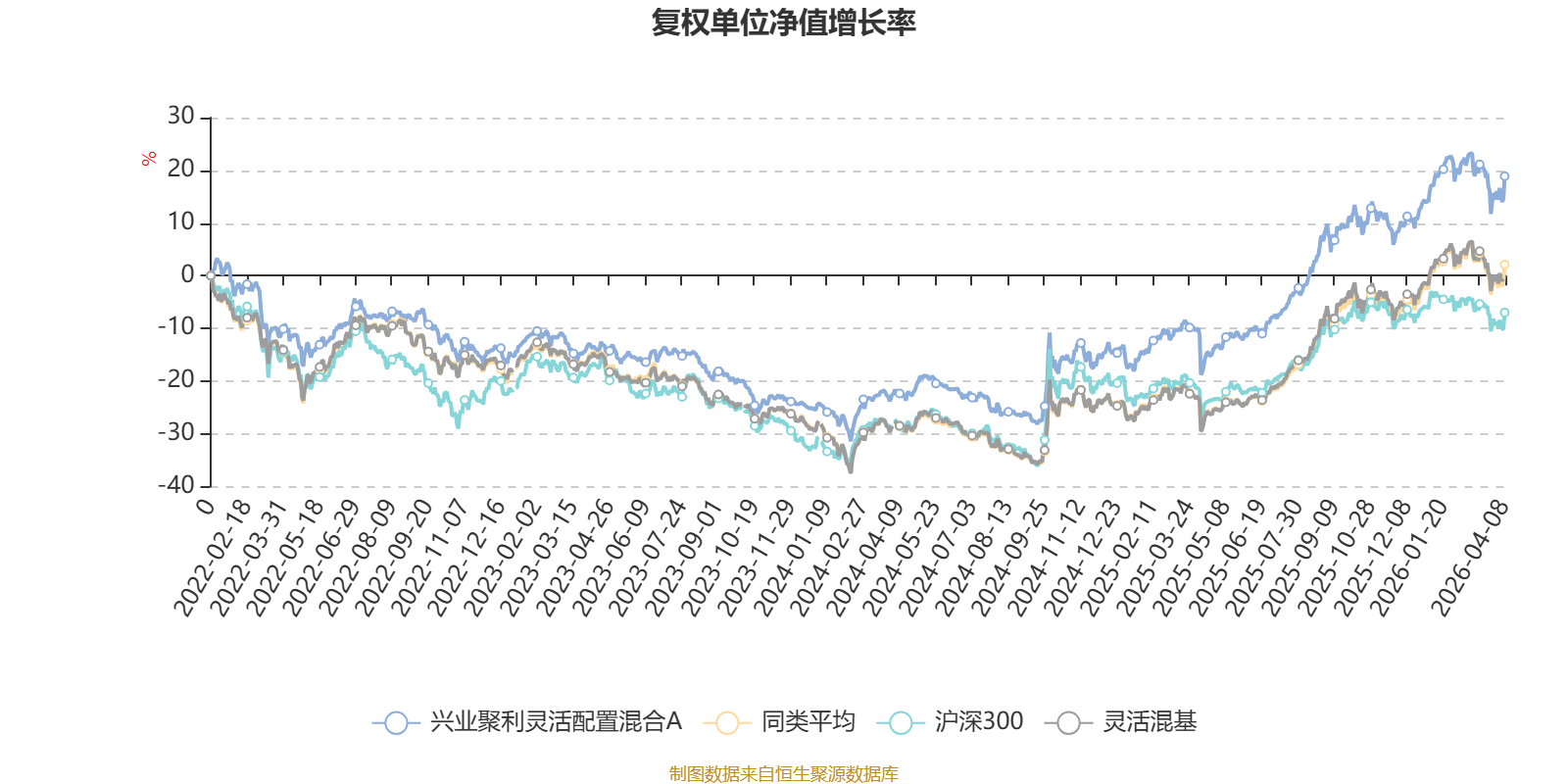 截至4月8日,兴业聚利灵活配置混合A近三个月复权单位净值增长率为1.61%,位于同类可比基金447/1287;近半年复权单位净值增长率为6.15%,位于同类可比基金438/1286;近一年复权单位净值增长率为45.67%,位于同类可比基金456/1286;近三年复权单位净值增长率为37.19%,位于同类可比基金255/1286。