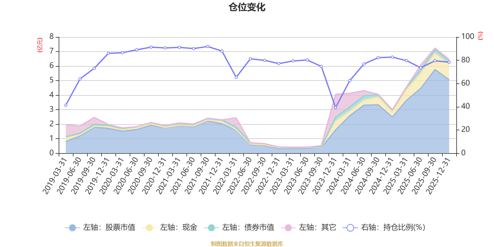 据定期报告数据统计,近三年平均股票仓位为74.11%,同类平均为72.57%。2021年三季度末基金达到91.87%的最高仓位,2023年末最低,为39.35%。