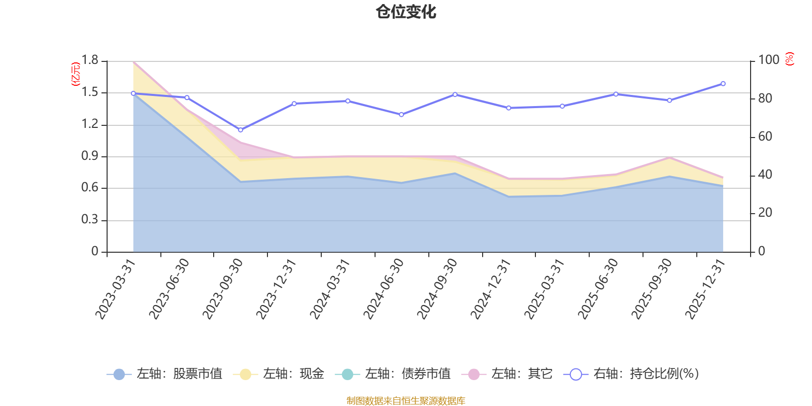 据定期报告数据统计,近三年平均股票仓位为78.36%,同类平均为84.04%。2025年末基金达到88.09%的最高仓位,2023年三季度末最低,为63.91%。