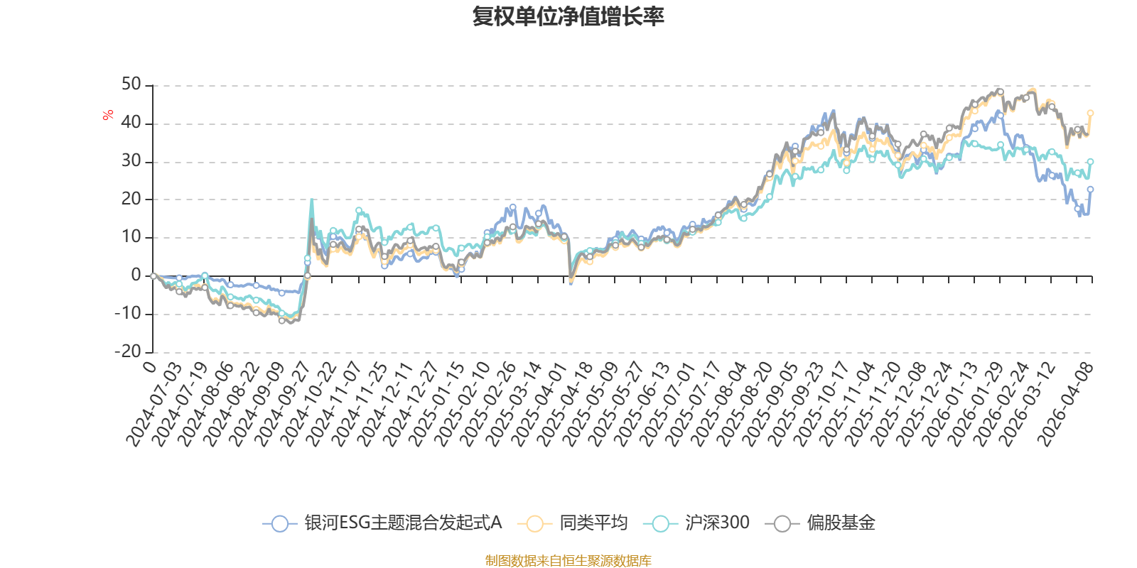 截至4月8日,银河ESG主题混合发起式A近三个月复权单位净值增长率为-10.11%,位于同类可比基金635/689;近半年复权单位净值增长率为-13.82%,位于同类可比基金639/689;近一年复权单位净值增长率为23.55%,位于同类可比基金512/685。