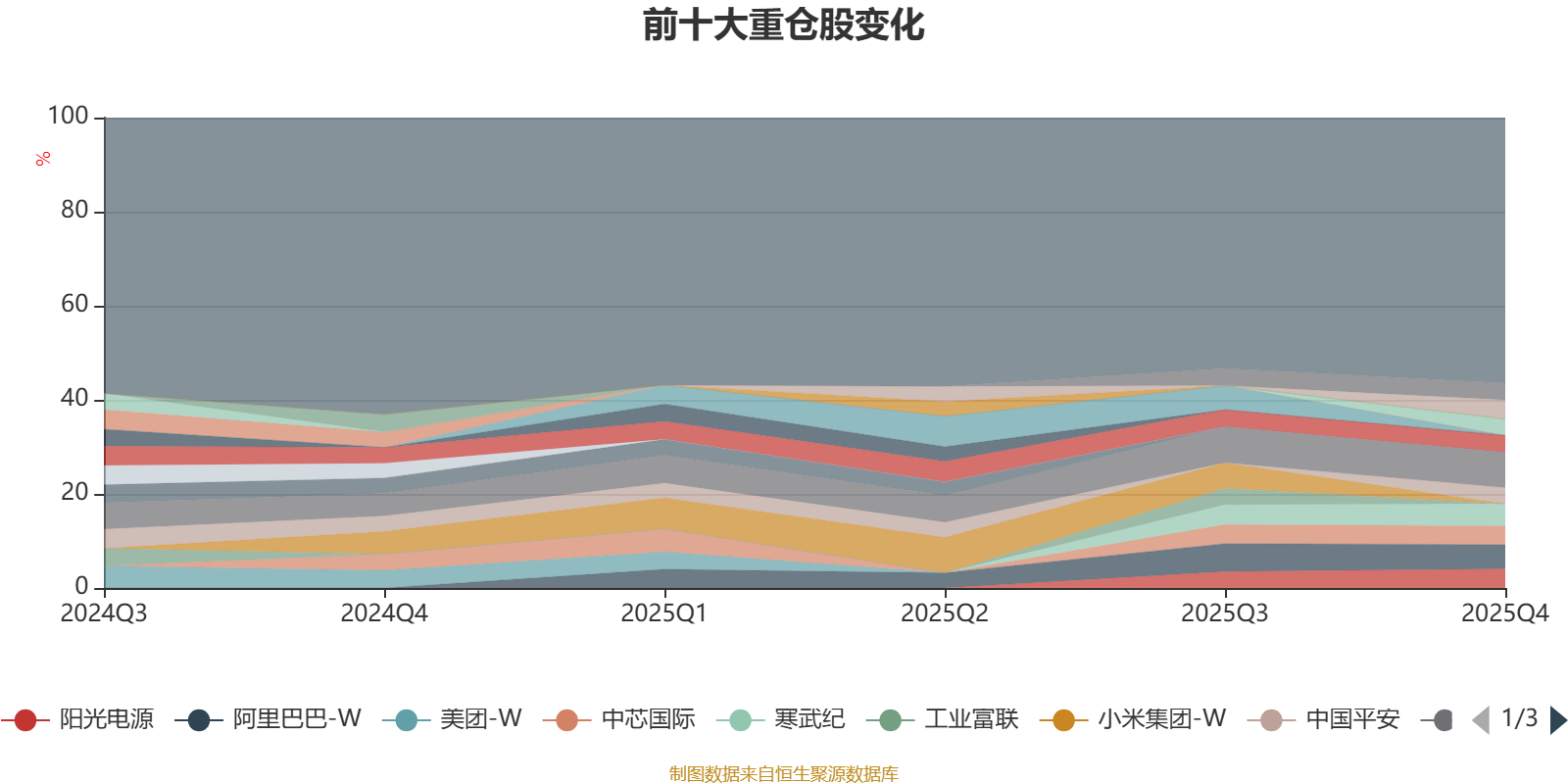 截至2025年末,基金十大重仓股分别是腾讯控股、阿里巴巴-W、寒武纪、阳光电源、中国人寿、中芯国际、香港交易所、海光信息、中际旭创、中国平安。