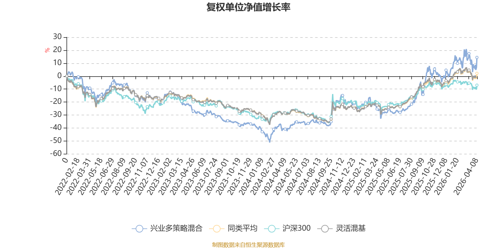 截至4月8日,兴业多策略混合近三个月复权单位净值增长率为3.00%,位于同类可比基金318/1287;近半年复权单位净值增长率为7.12%,位于同类可比基金384/1286;近一年复权单位净值增长率为68.34%,位于同类可比基金215/1286;近三年复权单位净值增长率为45.17%,位于同类可比基金182/1286。