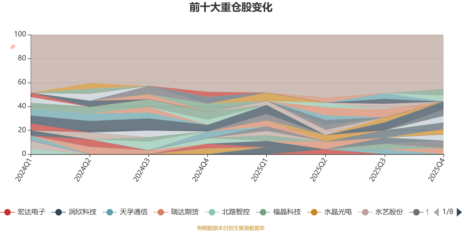 截至2025年末,基金十大重仓股分别是海光信息、恺英网络、永安期货、寒武纪、中芯国际、中油资本、南华期货、华虹公司、瑞达期货、华丰科技。